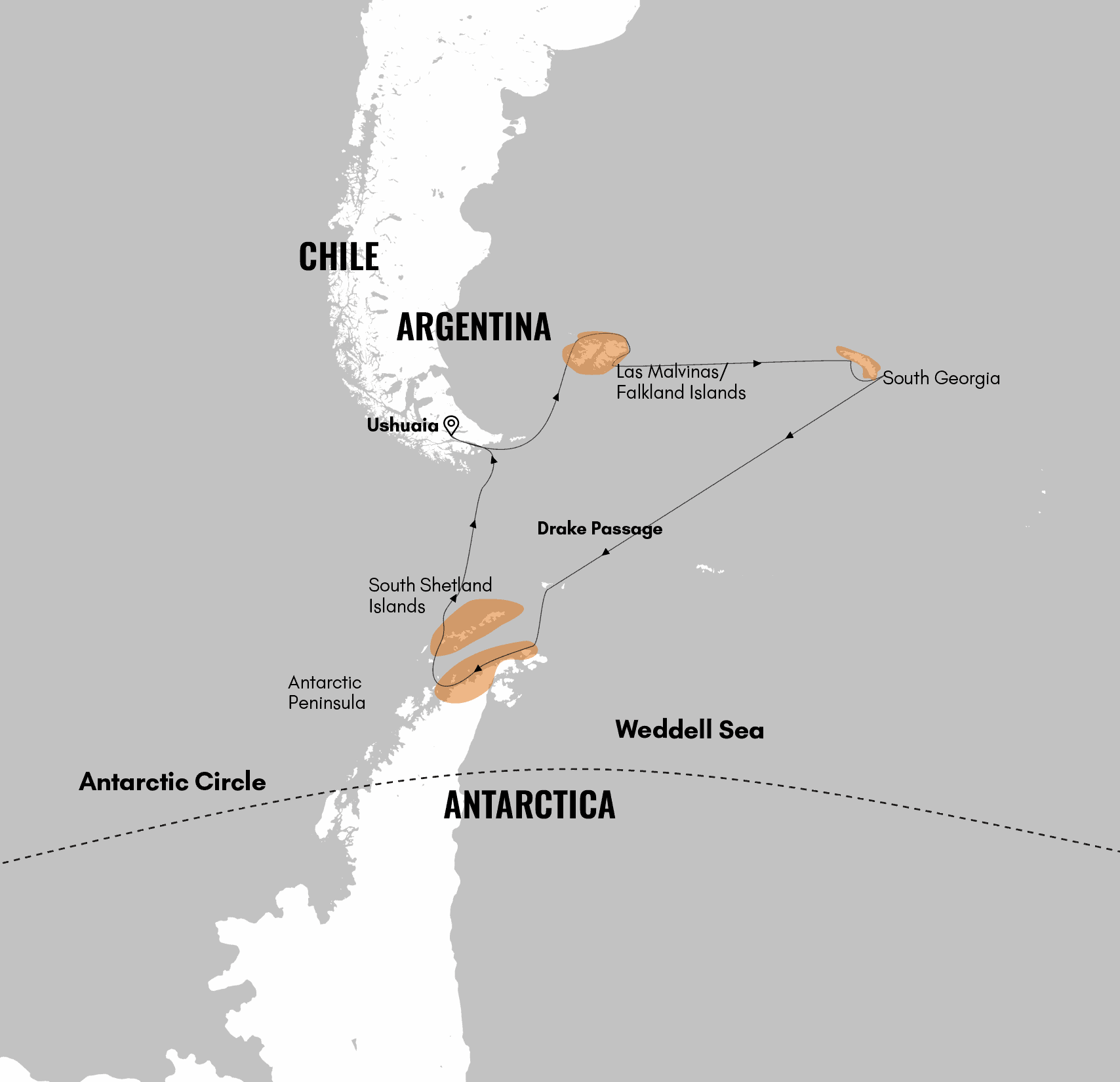 Reiseverlauf – Kingdom of Kings – Falkland, Südgeorgien, Antarktis
