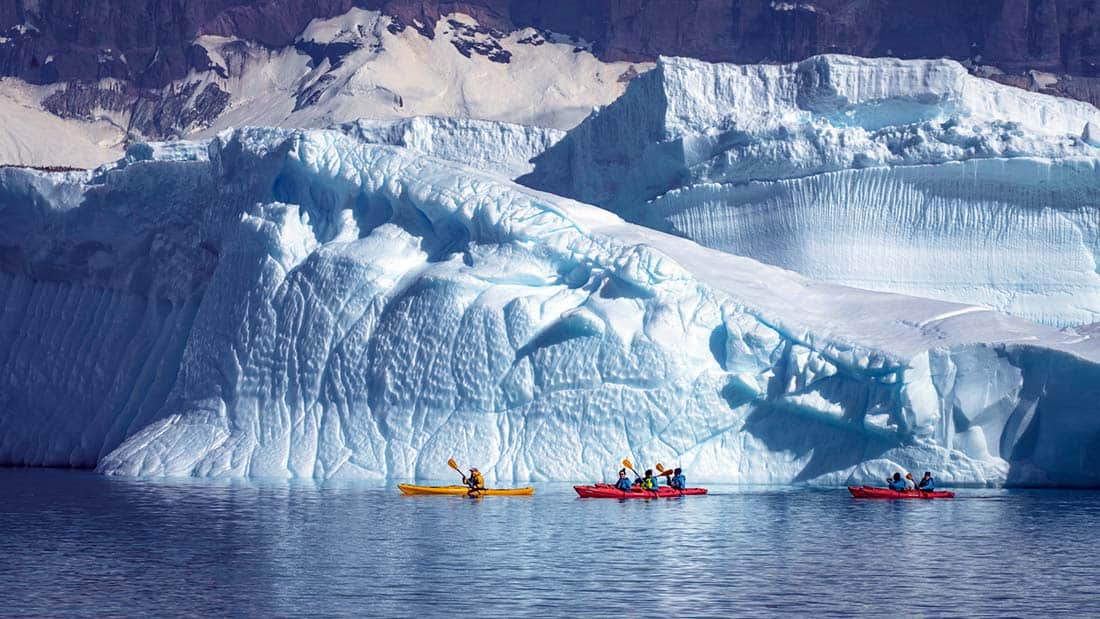 Kajakfahren: Paddeln Sie durch ruhige, eisige Gewässer, umgeben von skulpturalen Eisbergen, neugierigen Robben und tauchenden Pinguinen.